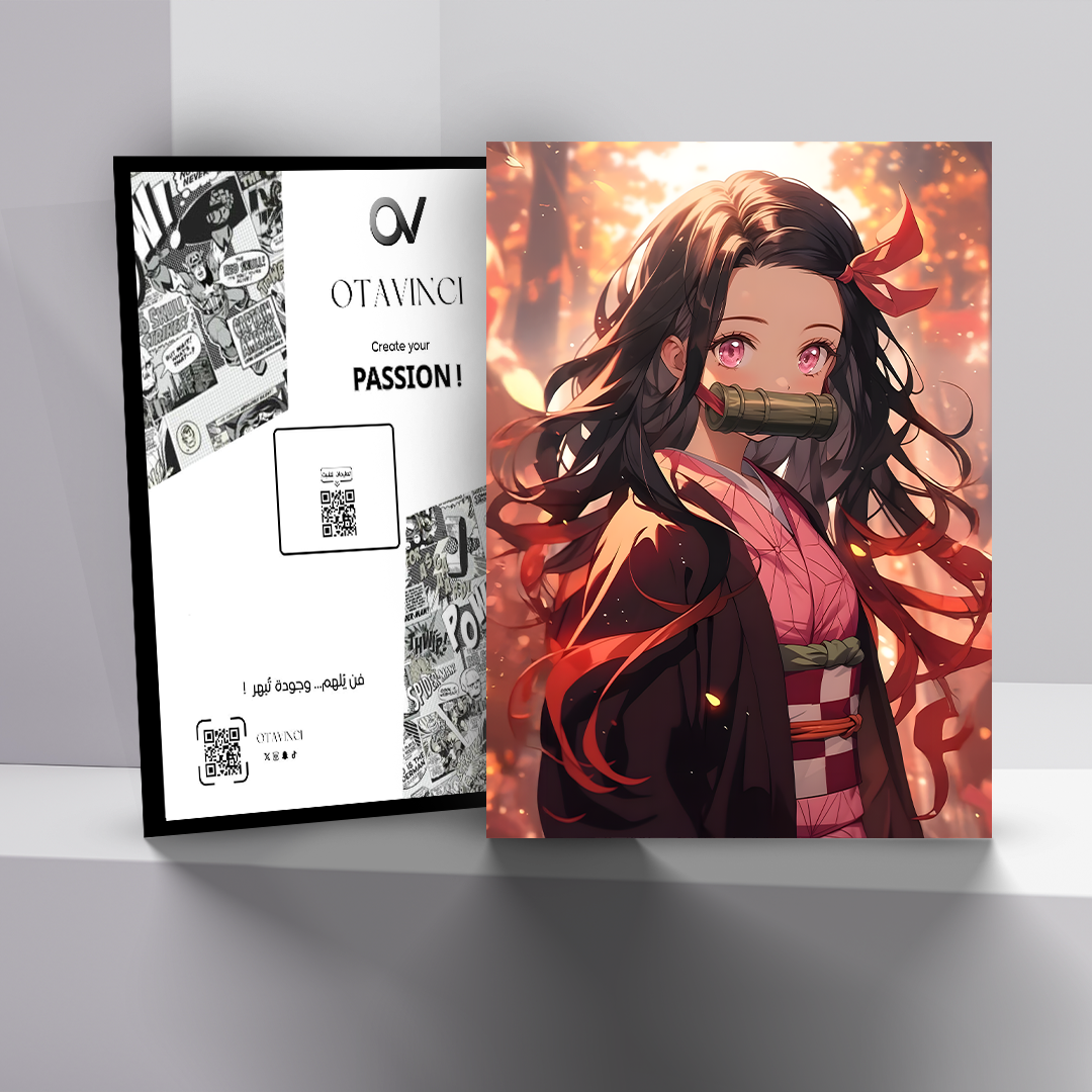 لوحة معدنية مطبوعة لشخصية نيزوكو من أنمي Demon Slayer، بتصميم فني مميز يضفي لمسة دافئة لأي غرفة أو ركن قيمينق.