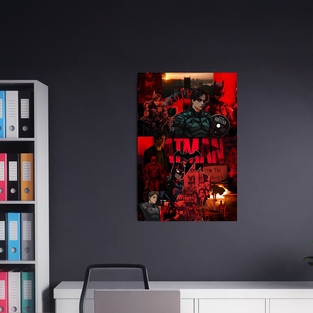بوستر فني داكن يجمع لقطات متنوعة من عالم باتمان، يظهر فيها باتمان ( روبرت باتينسون ) في أجواء حمراء قاتمة تعكس روح الغموض والعدالة.