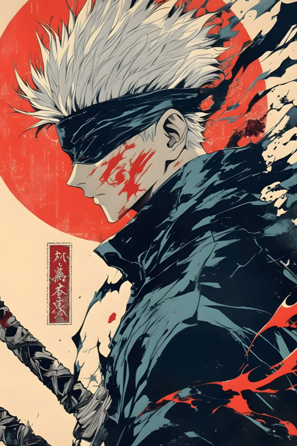 زين غرفك أو مكتبك مع بوستر معدني لشخصية جوجو ساتورو من أنمي Jujutsu Kaisen.